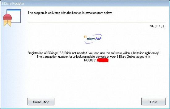 Besides the version 5 here you have also a transaction number now, so you can install SiDiary also on your PC and mobile devices (Pocket PC, Windows Smartphone and Java cell phones) and use it full functional.