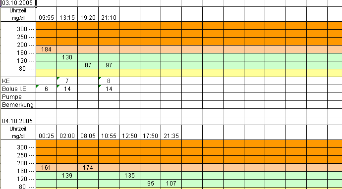 (Multi-Language-support!) Sehr schöne multilinguale grafische Auswertungen in Excel. Blutzucker in mg/dl oder mmol/l wird in Zusammenhang mit BE´s oder KH´s und bis zu 4 Insulinsorten gesetzt. BSR, Gewicht, Aceton und Blutdruckkurven können ebenfalls ausgegeben werden. Bietet diverse Analyse-/Filter-Möglichkeiten. Very nice multilingual graphical reports in Excel. Blood glucose in mg/dl or mmol/l will be set in the context of BE´s or Carbs and up to 4 types of insulin. BSR, weight, acetone and blood pressure curves can also be displayed. Offers various options for analysis and filtering. |