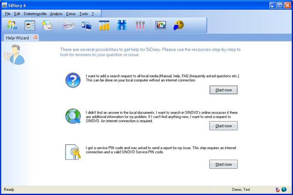 If you have questions regarding SiDiary or need help – you can use this assistant. The assistant provides you with three options that you should use until your problem is solved.