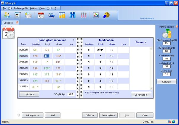 Click in any cell to enter values. You can add a star (*) to the blood glucose values to mark these values as "postprandial" – this means a value after meal.
