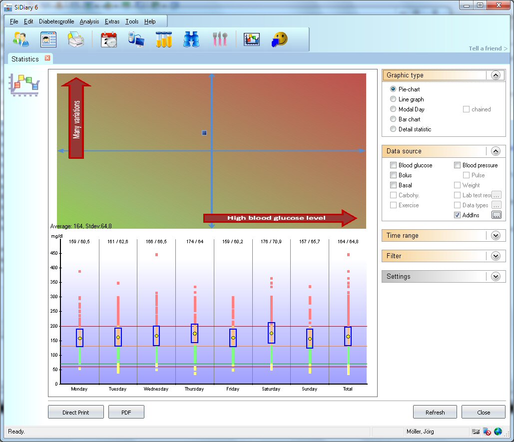 An additional statistic graph shows an x/y-graph (dot-graph) with all selected BG values. Details